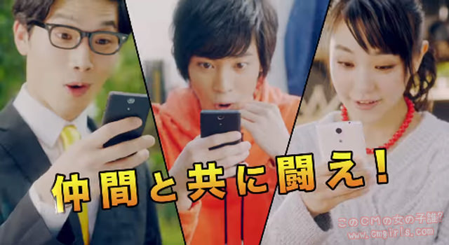 とのナレーションと共にスマホ片手に2人の男性と、1人の女性がゲームを体感。